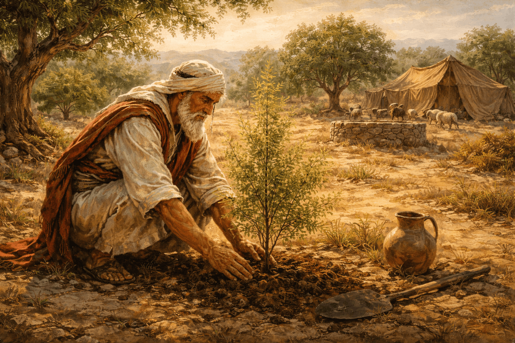 After celebration comes something quieter—but just as meaningful. Abraham plants a tree.