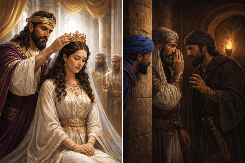 These two scenes sit side by side for a reason. Esther is elevated. Mordecai acts with integrity. Neither knows why it matters.