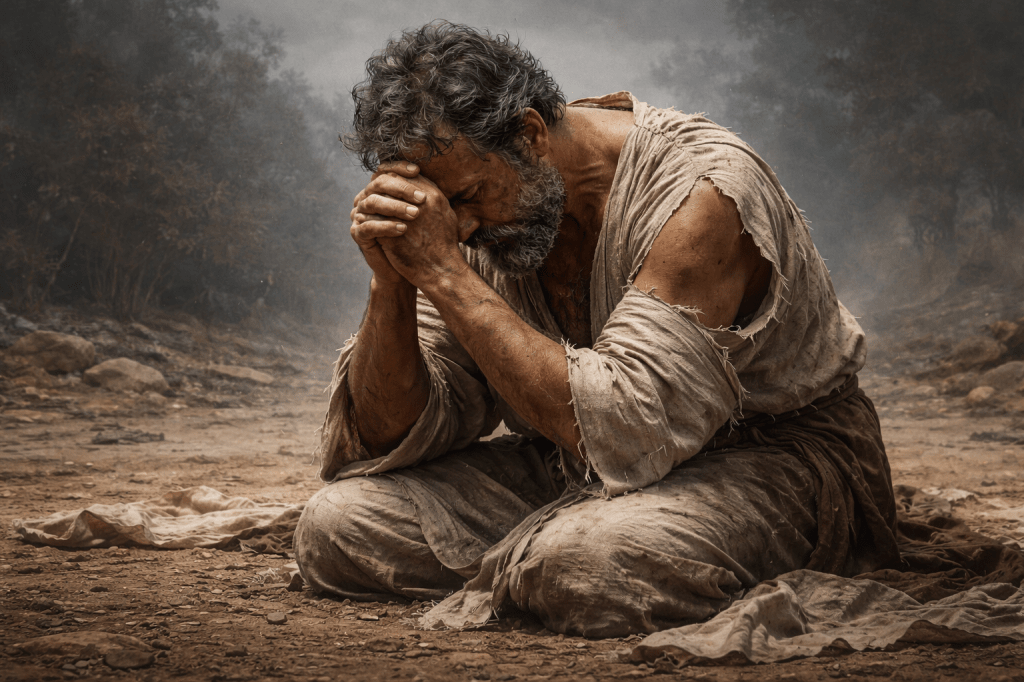 Job responds physically and visibly. His robe is torn. His head is shaved. His body reflects what has been taken from him. Then he falls to the ground and worships.